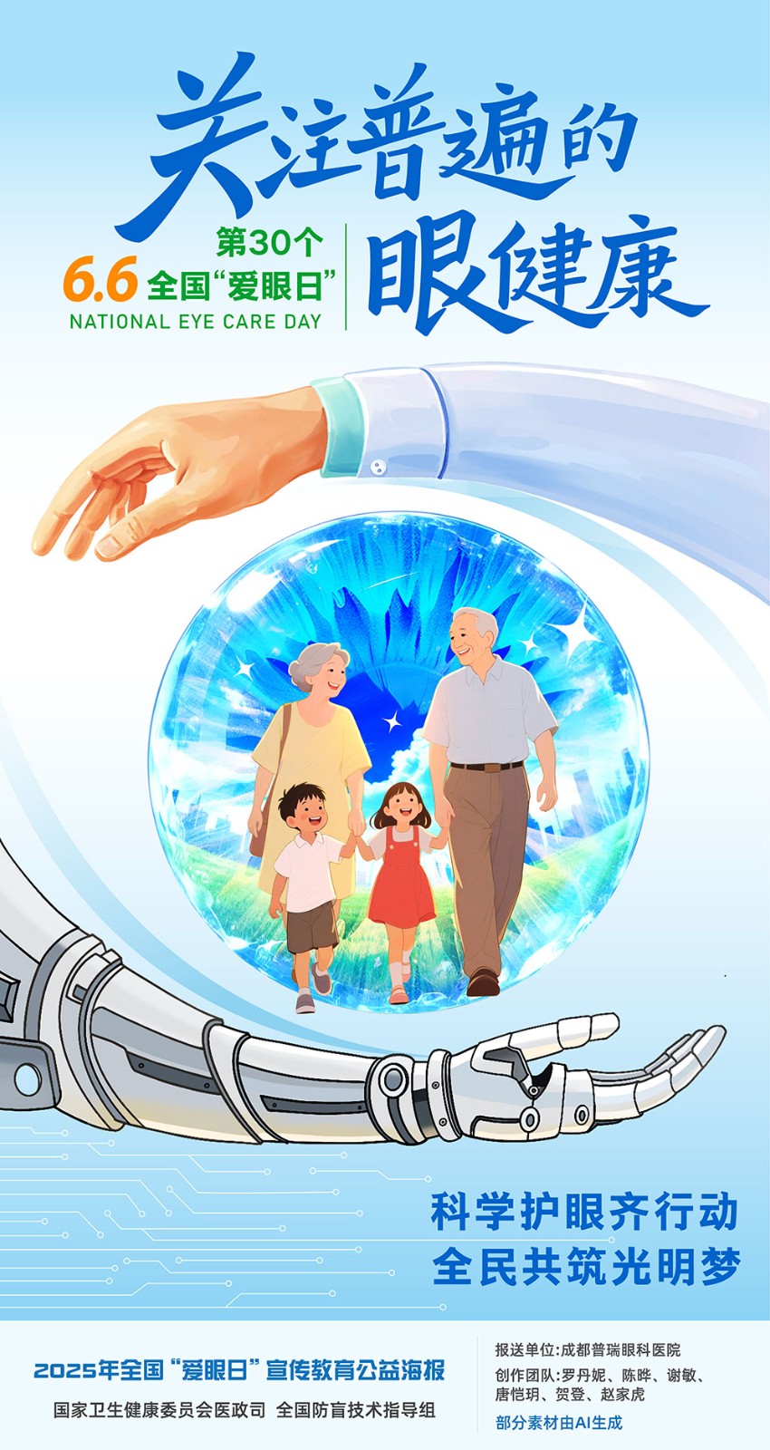 2025年6月6日是第30个全国“爱眼日”。今年活动的主题是“关注普遍的眼健康”。为充分调动社会各界积极性,前期面向各地征集了宣传海报。各地积极参与,报送了超过700张海报。经全国防盲技术指导组组织专家评审,遴选了5张公益海报。现在国家卫生健康委官网发布,供各地使用。
