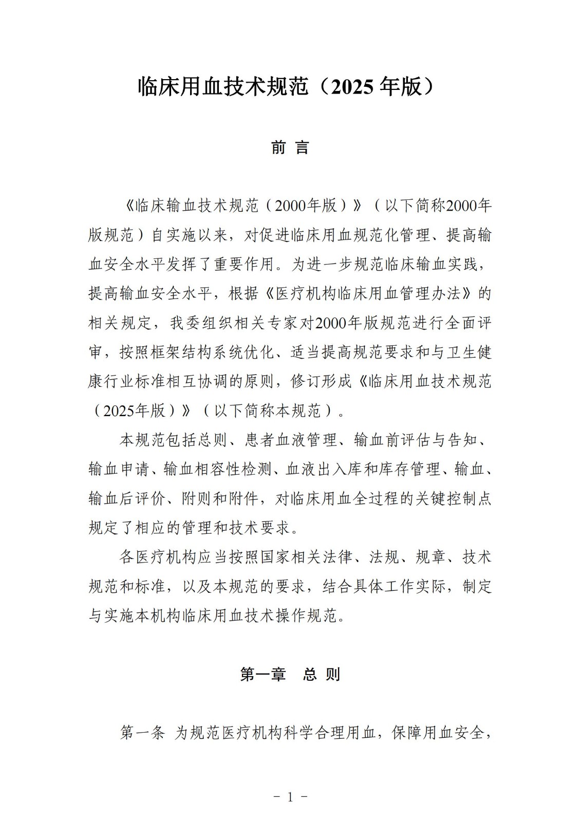 国家卫生健康委办公厅关于印发临床用血技术规范(2025年版)的通知